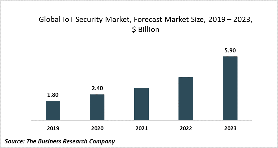 The global IoT security market is expected to grow from $1.8 billion in 2019 to $2.4 billion in 2020 at a compound annual growth rate (CAGR) of 34.8%. The growth of this market is mainly due to its important role in securing infrastructures such as in the commercial and industrial market. COVID-19 has pushed the world to adopt virtualization for global workforce which is resulting in the deployment and adoption of 5G services, which will ultimately drive the overall IoT security market. The global IoT security market is then expected to recover and grow at a CAGR of 34.8% from 2021 and reach $5.9 billion in 2023.