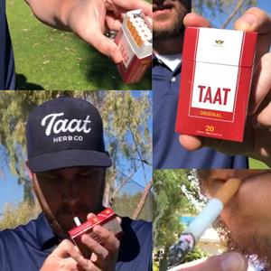 Taat Herb Co. Founder Joe Deighan in a recent video statement demonstrating how Taat is used, with a similar “ritual” to that of smoking a tobacco cigarette and comparable behaviour of the product when it is ignited