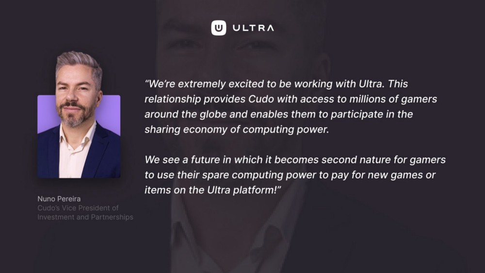 Nuno Pereira, Vice President of Investment and Partnerships: “We’re extremely excited to be working with Ultra. This relationship provides Cudo with access to millions of gamers around the globe and enables them to participate in the sharing economy of computing power. We see a future in which it becomes second nature for gamers to use their spare computing power to pay for new games or items on the Ultra platform!”