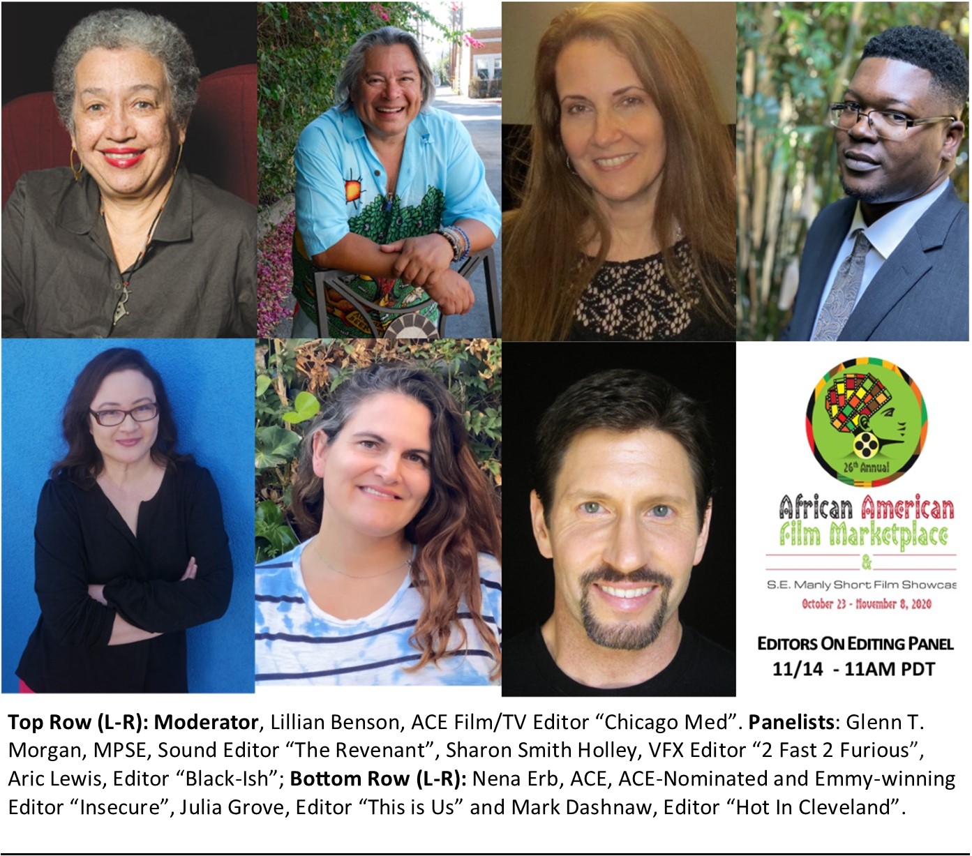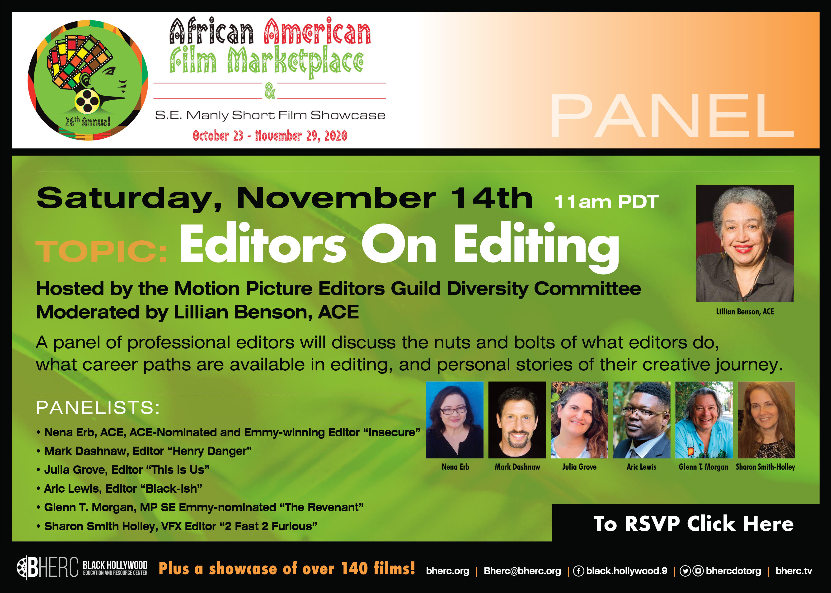 LOS ANGELES, CALIFORNIA, USA, November 12, 2020 /EINPresswire.com/ -- (Hollywood, CA) – The Black Hollywood Education and Resource Center (BHERC) joins with the Motion Picture Editors Guild Diversity Committee (MPEG) to present an inclusive and powerful panel and discussion on the profession of editing and post-production. “Editors on Editing” moderated by Lillian E. Benson, ACE, film and television editor who currently serves as co-chair of the Motion Picture Editors Guild Diversity Committee is slated to take place Saturday, November 14, 2020 at 11:00AM (PDT). The 4th in a series of industry panels offered at the 26th Annual African American Film Marketplace & S.E. Manly Short Film Showcase (AAFM SEMSFS) airing online at www.BHERC.TV now through Sunday, November 29, 2020. The festival offers more than 140 curated films with stories of all genres told by diverse filmmakers from 18 countries and 20 US states of all ages, the youngest being nine years old.