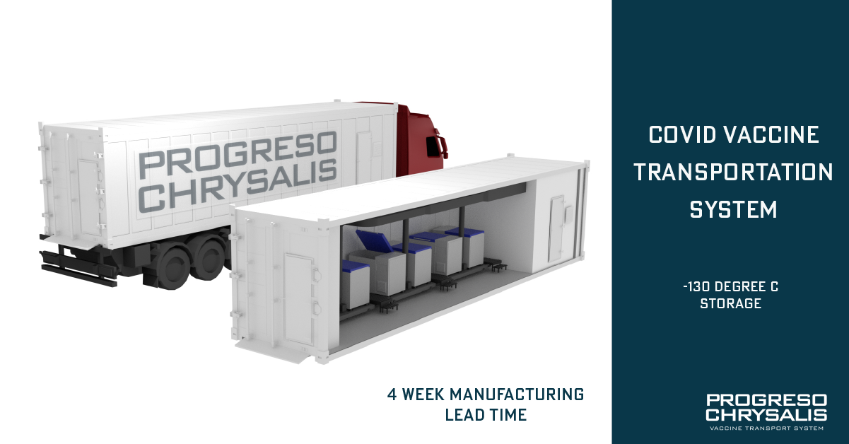 The Progreso Group have designed the Progreso Chrysalis Vaccination Storage & Transport System which aims to “solve the logistical challenges of ensuring COVID-19 vaccines get to those who need it no matter where they live.”