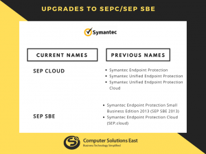 Upgrades to Symantec Endpoint Security Cloud (SEPC) or Symantec Endpoint Protection Small Business Version are available to customers with a current and valid subscription (SEP SBE 2013). Both solutions were previously referred to as different names, so there is a table below with these services' previous names.