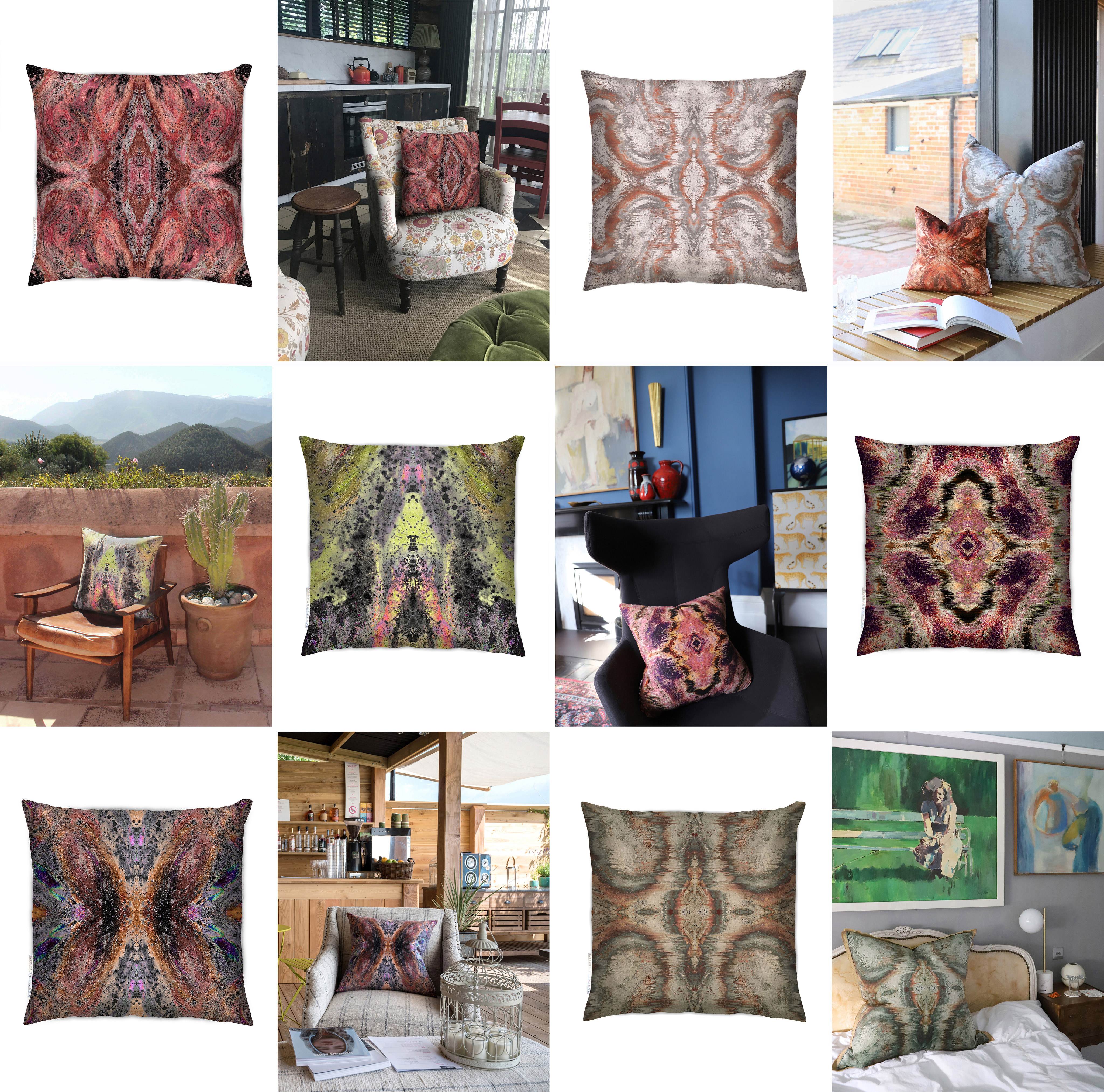 All Gallery Beautiful cushion designs are available in two fabrics options; sumptuous indoor velvet or a self-piped outdoor breathable waterproof fabric, and in four versatile sizes – from small scatter cushions and large throw pillows to extra large bed and floor cushions. The removable covers with concealed zipper have the same design on both sides, and are printed using eco inks because “we love our mother Earth.”
