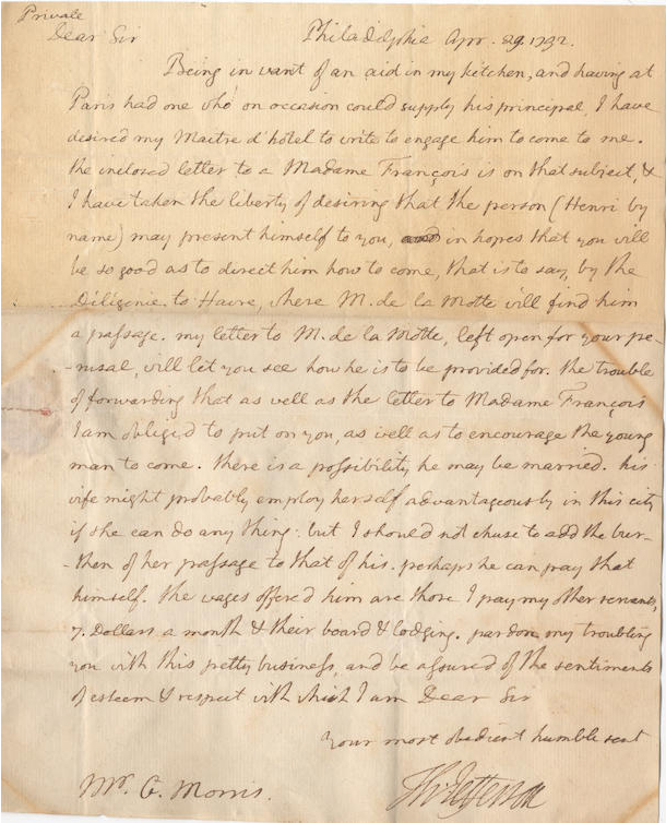 Signed letter from Thomas Jefferson to Gouverneur Morris requesting assistance with hiring a French chef, written and sent in 1792 (est. $14,000-$16,000).