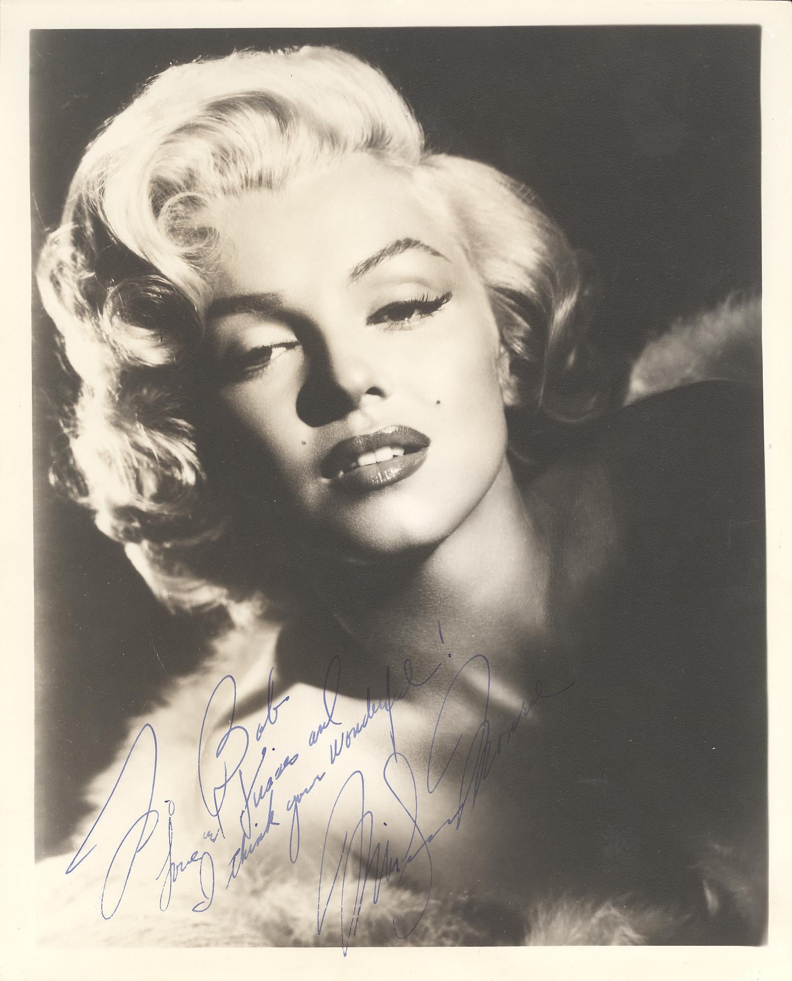 Signed and inscribed portrait photograph of Marilyn Monroe, inscribed to “Bob” (likely Robert Mitchum, Monroe’s co-star in the 1953 film River of No Return) (est. $12,000-$14,000).