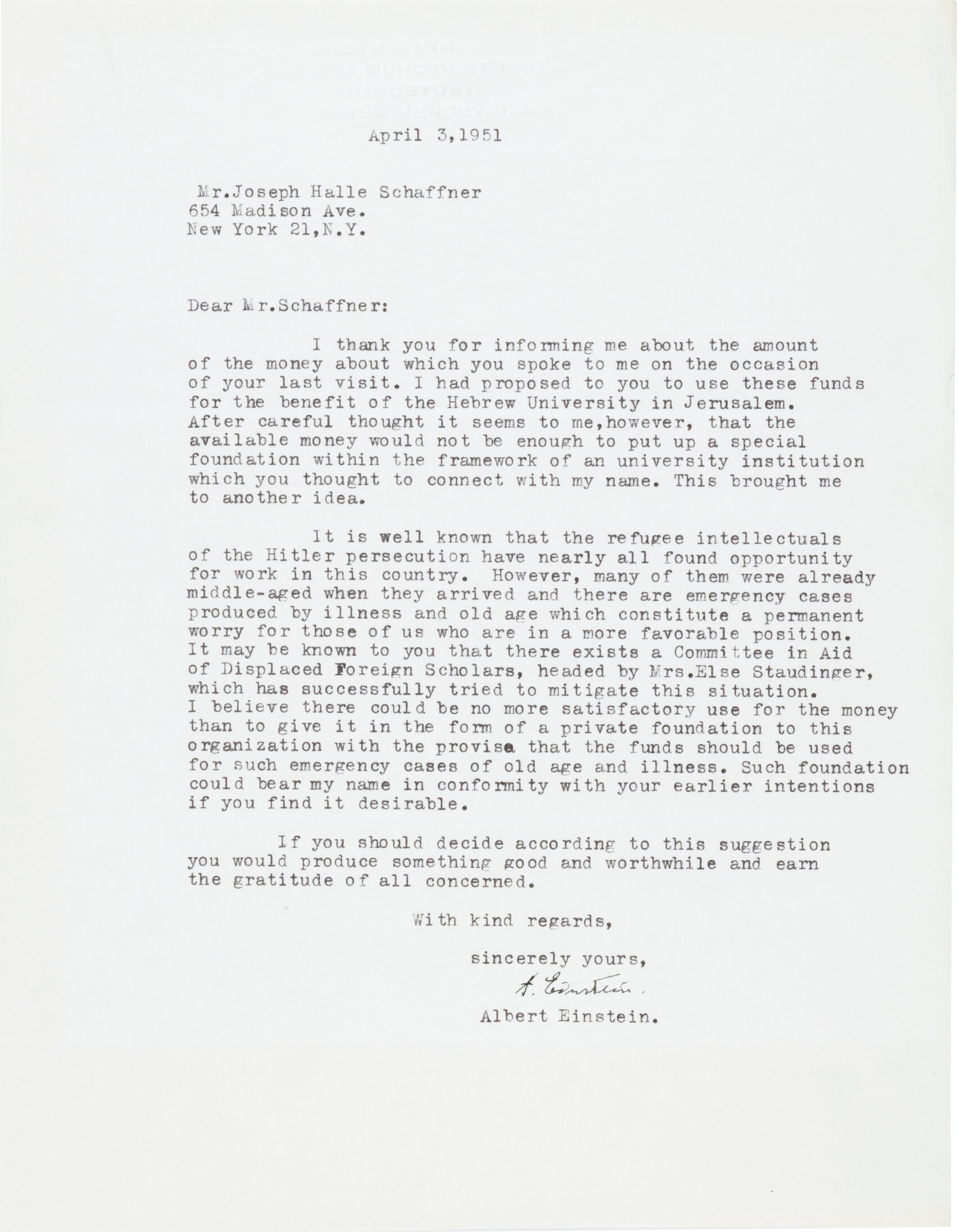 Typed letter signed by Albert Einstein suggesting businessman Joseph Halle Schaffner donate to the Committee in Aid of Displaced Foreign Scholars (est. $9,000-$11,000).