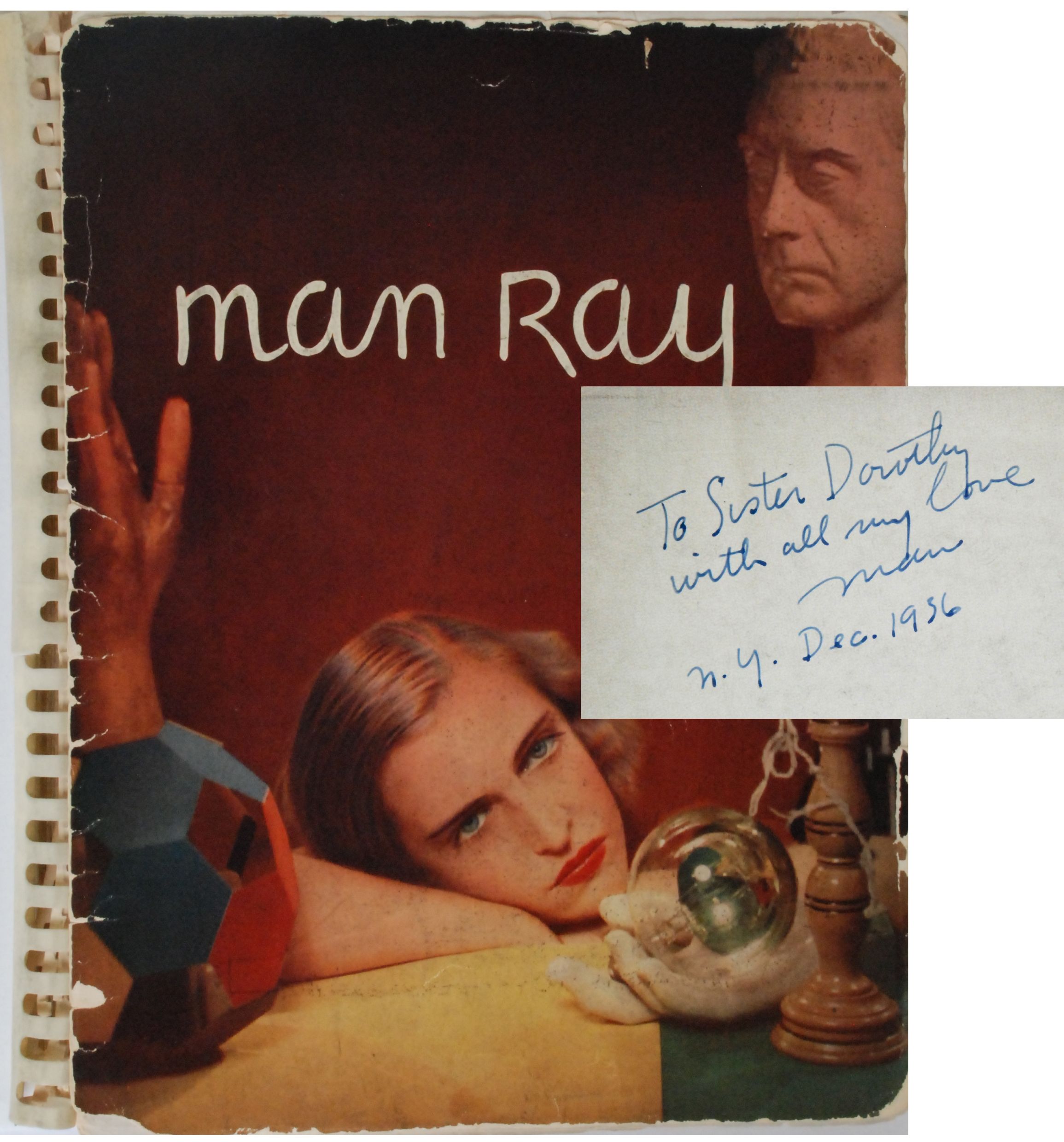 A signed collection of striking photographs from the surrealist artist and photographer Man Ray (US/France, 1890-1976) is covered in a colorful pictorial wrapper. The content leaf is inscribed “To sister Dorothy with all my love.” The lot includes an exhibition notice for Man Ray’s work at the Julien Levy Gallery in April 1945 and should hit $5,000-$7,000.