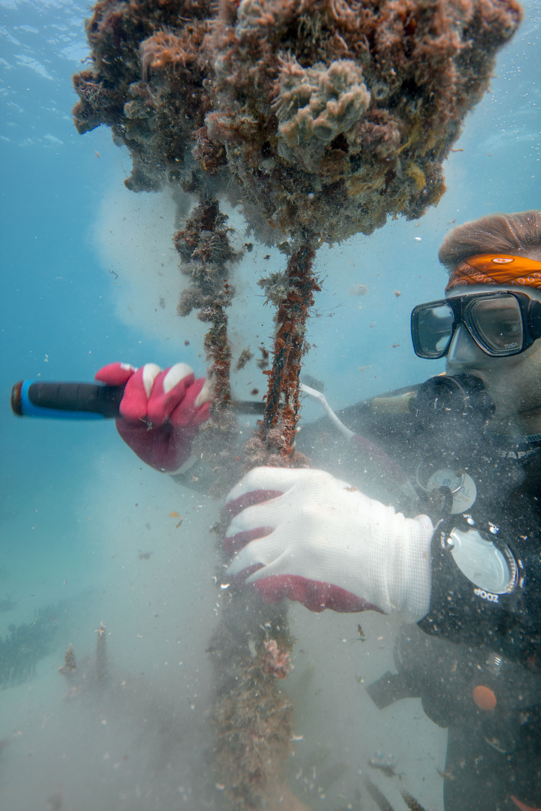 This year Coral Restoration Foundation™ is inviting students to help them tackle the problem of biofouling. The organization has over 750 Coral Trees in their ocean-based Coral Tree Nurseries. These Coral Trees are the structures that allow the team to raise more than 45,000 reef-ready corals every year. But, in the open ocean, these Coral Trees are also a great habitat for other types of marine life including algae, barnacles, and hydroids. These organisms weigh the trees down and compete with the corals for space and nutrients, creating less-than-ideal conditions for the corals to thrive. This accumulation of organisms is called” biofouling”. The Coral Restoration Foundation™ team goes out every day to “battle the biofoul” in their nurseries. Each tree takes between 45 minutes to an hour to clean. This means that the team spends almost 2,000 hours every year battling biofouling in Tavernier Coral Tree Nursery alone. By reducing the time it takes to clean the Coral Trees, Coral Restoration Foundation™ could return many more corals to the reef every year.