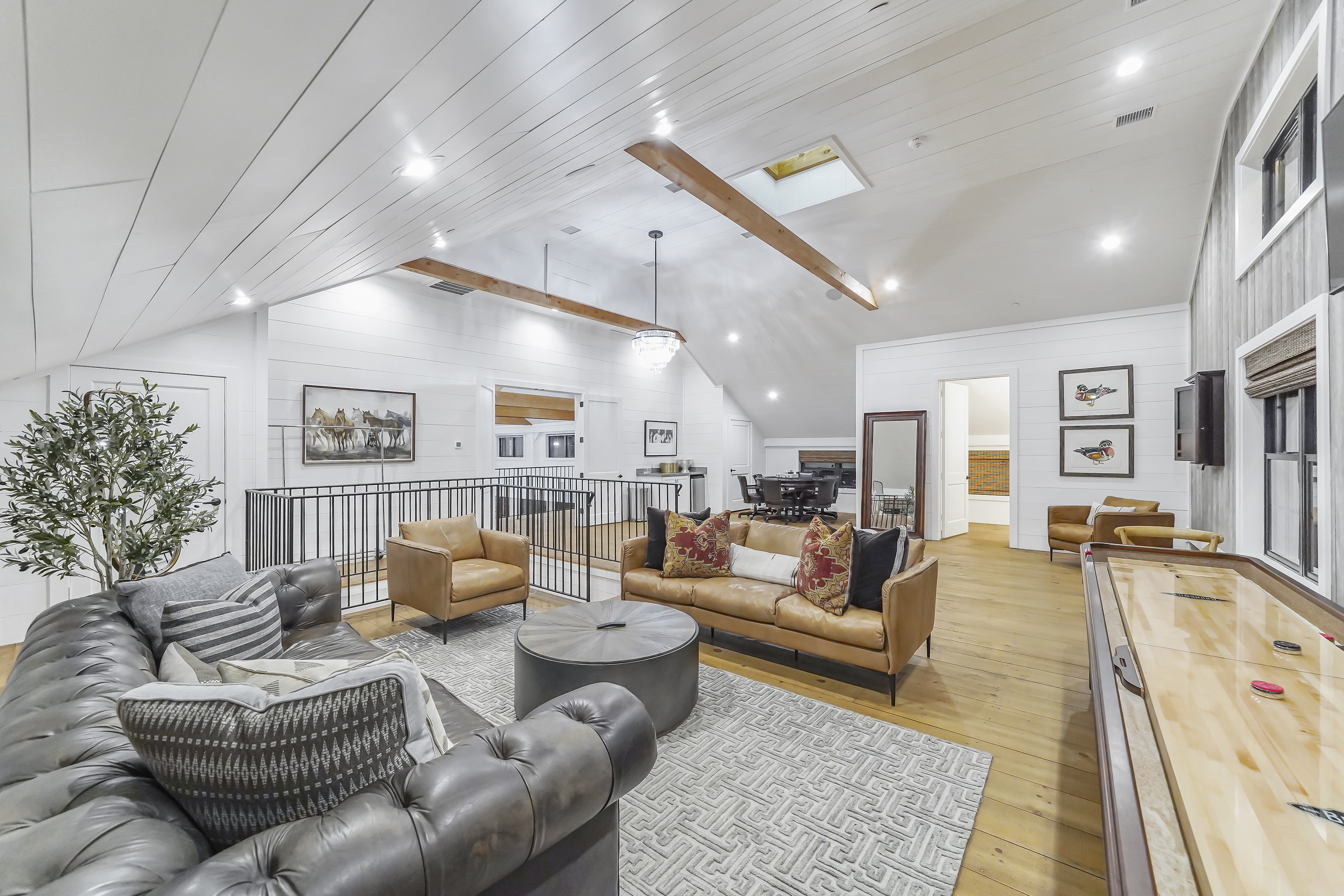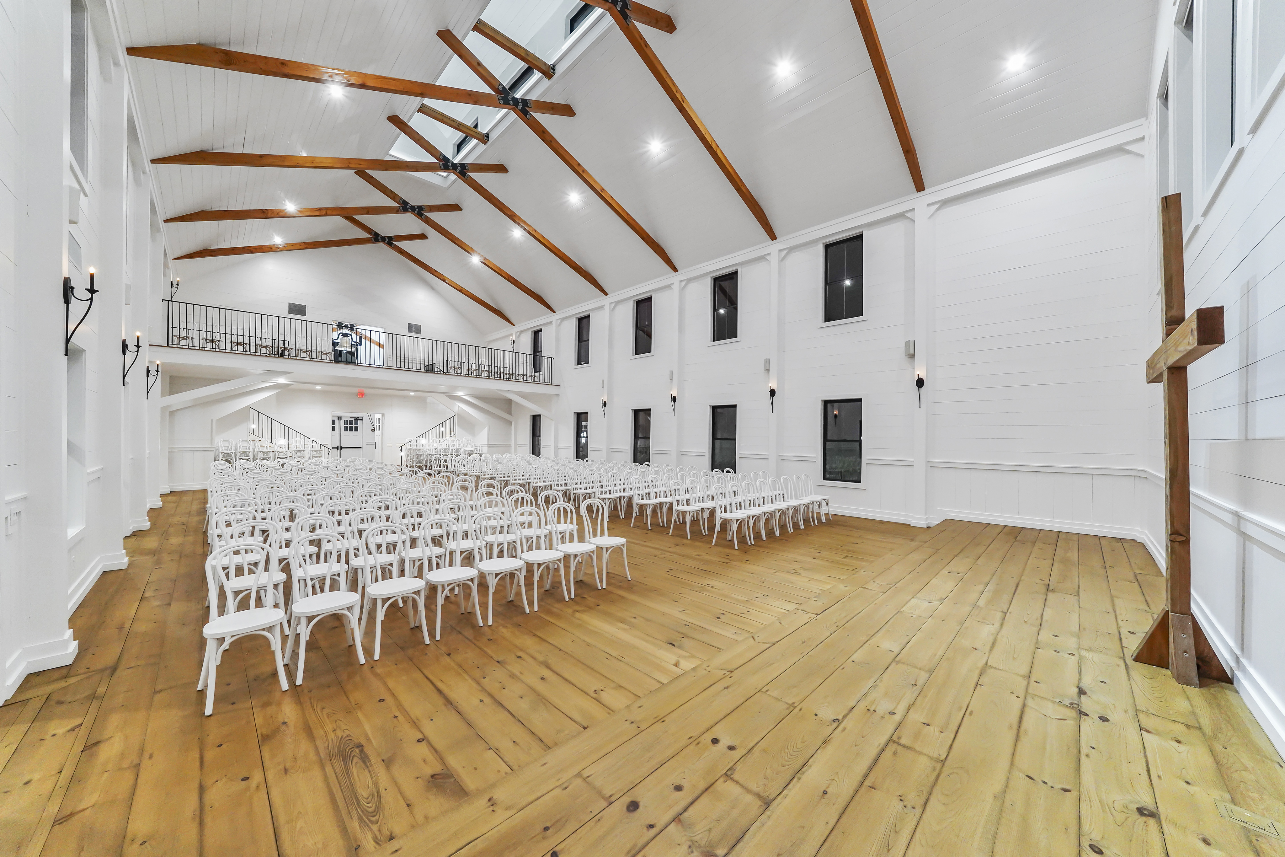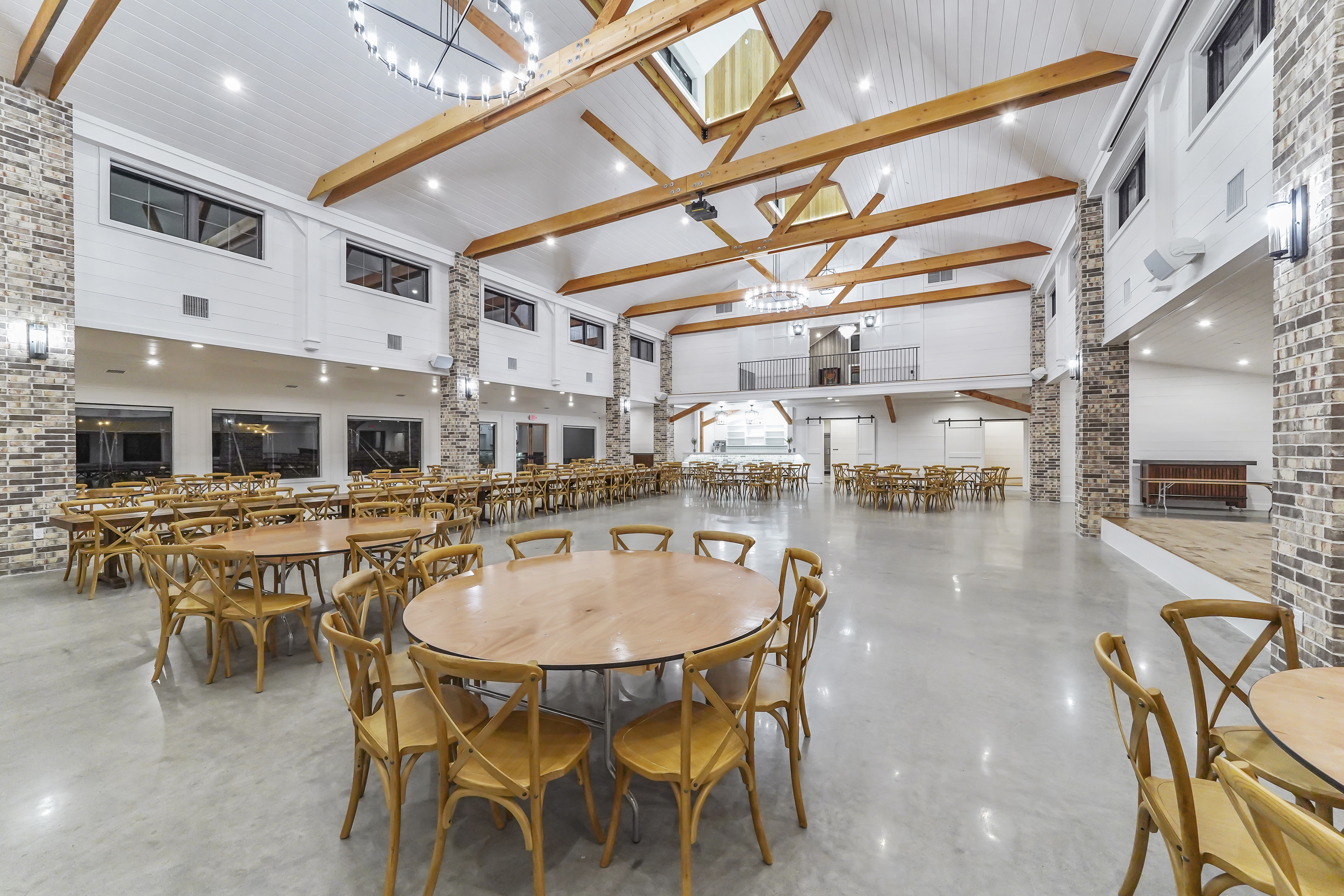 Additional features include a 3,640-square-foot chapel with viewing mezzanine and foyer that can accommodate 400 guests, and is built with natural wood beam scissor trusses, hardwood floors, and white wood walls; a 5,900-square-foot primary event space with polished concrete floors, enclosable balconies, vaulted ceilings, built-in stage, and full bar area—as well as an 800-square-foot caterer’s kitchen, a bridal suite, and a groom’s suite; an outdoor dining and entertaining area spanning 4,000 square feet with mature trees and lake views; a 3,100-square-foot, 4-bedroom, 3-bathroom primary residence with a 3 car-garage and office space; a 2,200-square-foot, 2-bedroom, 2-bathroom secondary residence with lake views;a 5,750-square-foot-barn with a 2-bedroom 2-bathroom condo; parking to accommodate 200 vehicles with light poles and electrical outlets; fully climate-controlled structures and fiber internet spanning the full property; outdoor equipment for guests to paddle boat, fish, and enjoy lawn games; and eco-friendly construction, utilizing less than 1% waste—all just 5 miles to Lake Conroe and 30 minutes to The Woodlands.