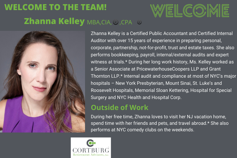 NEW YORK, NEW YORK, USA, December 15, 2020 /EINPresswire.com/ -- Zhanna Kelley has joined the financial planning firm of Cortburg Retirement Advisors, Inc. as an accounting and tax coordinator. — Miguel Gonzalez, Managing Partner