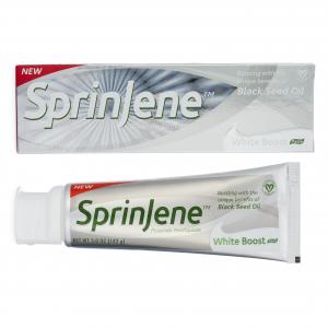 SprinJene White Boost® features a patented formula with zinc and black seed oil, which together controls tartar growth, remineralizes enamel, and delivers long-lasting oral freshness. Black Seed oil and zinc have been shown to fight gingivitis (gum disease) and reduce gum inflammation.