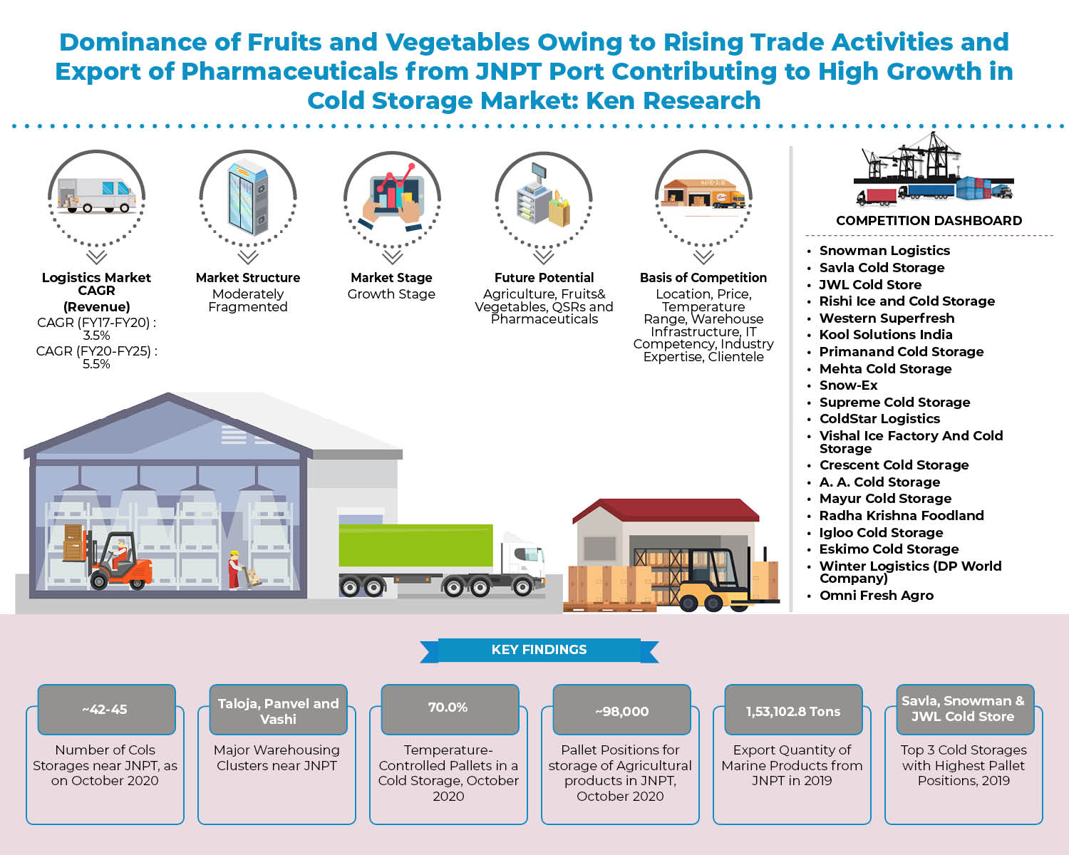 INDIA, December 16, 2020 /EINPresswire.com/ -- Strategic Location: Located closer to the financial capital of India, JNPT has an advantage of having access to a very well connected highway network. The cluster has proximity to the Mumbai-Goa highway and the Mumbai-Pune highway, largely handling cargo traffic for Maharashtra, Madhya Pradesh, Gujarat, Karnataka, as well as most of North India.Rising Demand of Cold Storage: Increase in exports and imports of agricultural and pharmaceutical products along with government support for investment in cold chain infrastructure, the demand for cold storages from other end user industries like meat and seafood, pharma, and frozen food and QSR is expected to grow in the future, as well as from fresh food which was previously not stored in cold storages.