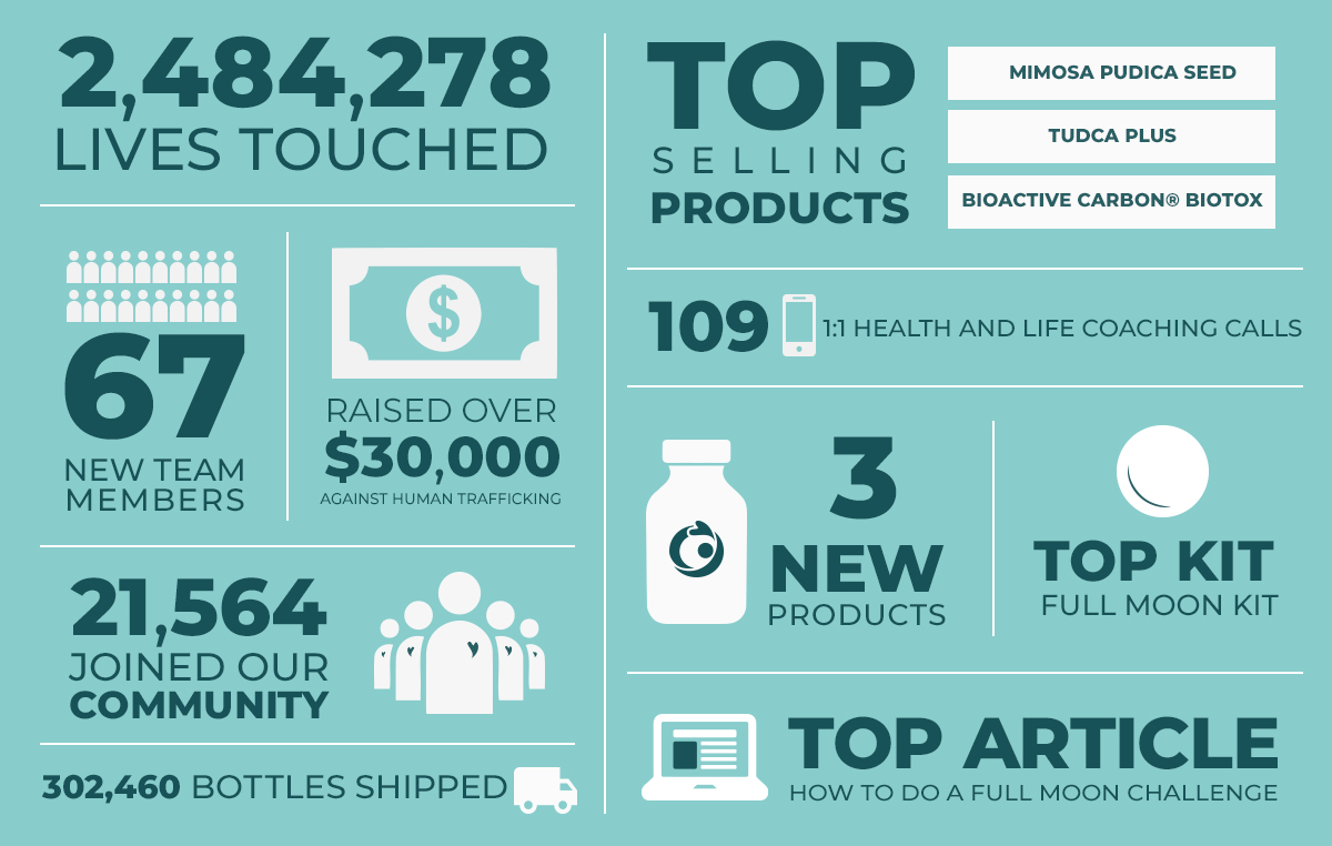 • 2020 counted 2,484,278 total lives touched. This includes the number of people reached through customer support emails and phone calls, life and health coaching sessions, product shipments, site visitors, and the weekly online Q&A attendees.