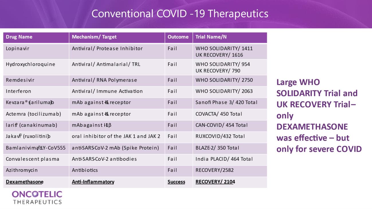OT-101 is also being developed as an adjuvant for second generation COVID-19 vaccine. To avoid the two potential issues with 1st generation vaccine against COVID-19, we will be combining the 1st generation COVID-19 DNA vaccine with a TGF-β inhibitor (OT-101) to stimulate a strong immune response while suppressing the IgA class switching that could aggravate the disease through Kawasaki reaction- IgA vasculitis. The company is aggressively pursuing the development of this 2nd generation COVID-19 vaccine expecting that the 1st generation vaccines would not be fully effective and may not be sufficiently protective to counter the current pandemic.