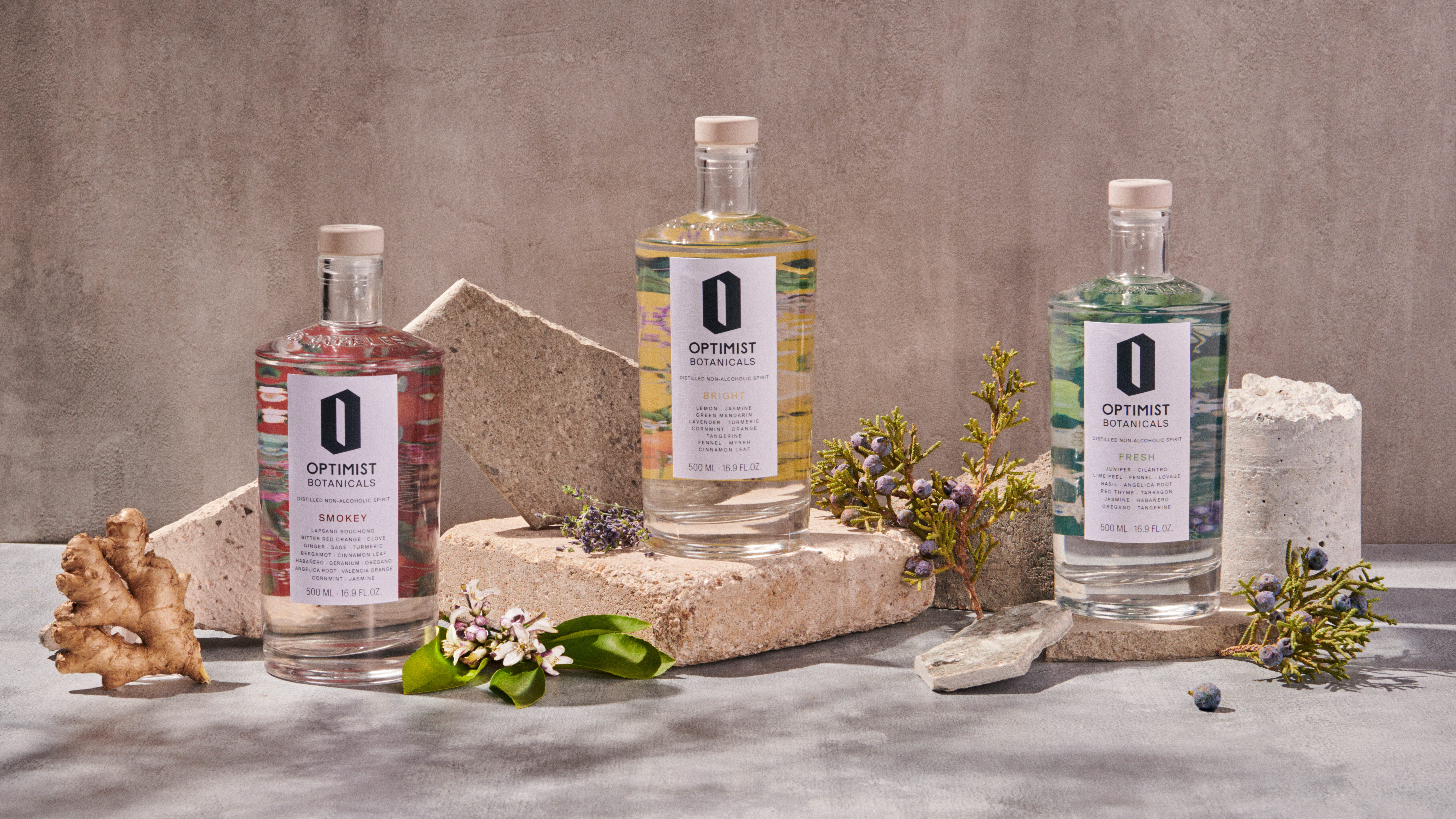 Optimist Drinks’ first offering is a signature distilled non-alcoholic botanical spirit range that comes in three elegant blends, BRIGHT, FRESH, and SMOKEY. Liquid botanical love-letters to Los Angeles, each unique flavor takes those tasting it on a sensory journey to salt-sprayed coastlines (BRIGHT), verdant canyons (FRESH) or the dusky high desert (SMOKEY).