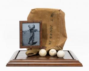 The Bobby Jones personal golf shag bag – brown leather, personalized with Jones’s name in original stencil (“R. T. Jones Jr., an abbreviation of his full birth name, Robert Tyre Jones) – came with three golf balls (unassociated) and a copy of a photograph of Jones, all housed in a Lucite and wood display case. The lot boasted an impeccable provenance.