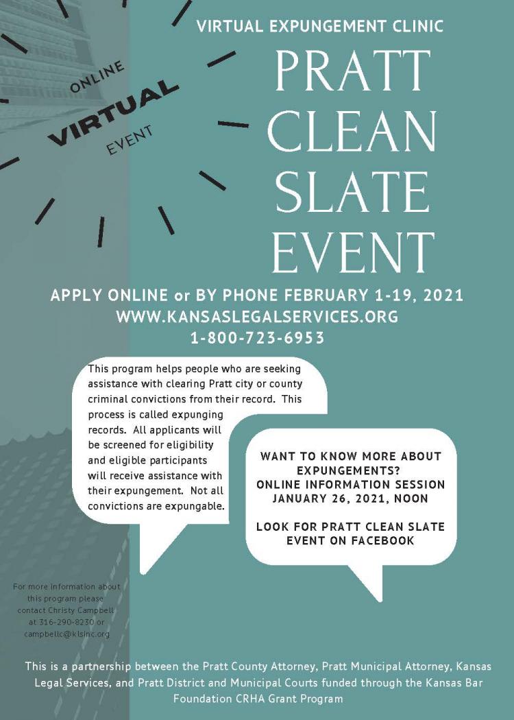 This project is funded through the Kansas Bar Foundation CRHA Grant Program and is a partnership between the Pratt County Attorney, Pratt Municipal Attorney, Pratt District and Municipal Courts and Kansas Legal Services.