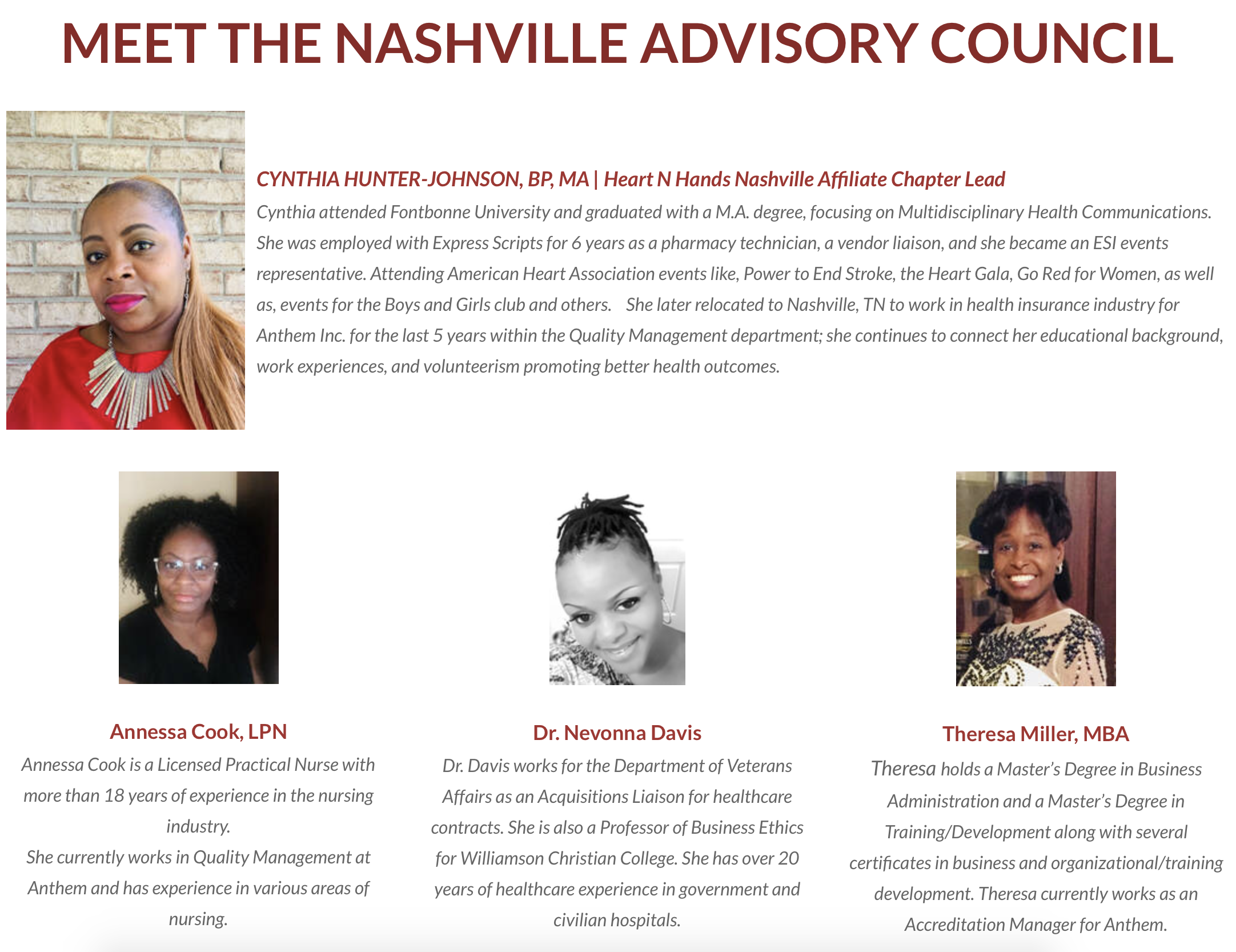 Cynthia Hunter-Johnson, BP, MA, will lead the Heart N Hands Nashville Chapter. A versatile philanthropist who has dedicated her knowledge and expertise to spreading awareness of heart health, Hunter-Johnson will coordinate events and programming in synergy with the organization's mission. She is joined by three members of the Nashville Advisory council, Annessa Cook, LPN, Dr. Nevonna Davis and Theresa Miller, MBA.