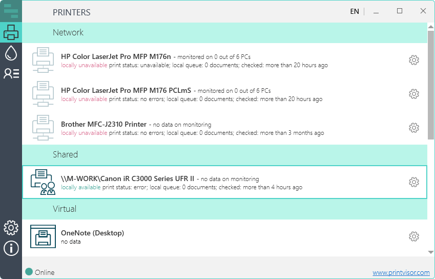 Za pomocą PrintVisor można śledzić atrament i toner w drukarkach, monitorować kolejki drukowania, sprawdzać statusy drukarek i obserwować zwyczaje związane z drukowaniem w całej firmie. Administrator systemu (lub np. kierownik biura) może utrzymywać aplikację w tle, aby nie rozpraszała ona pracowników.