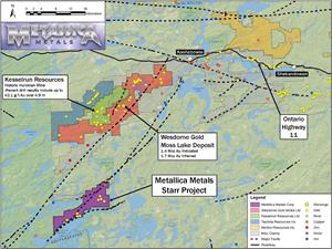 Location of Metallic Metals’ Starr gold-silver project with respect to adjacent properties including the Moss Lake gold deposit (data sources: 2013 NI 43-101 Technical Report and PEA for the Moss Lake Project – see further reference details below; Kesselrun Resources October 7, 2020 news release)