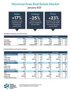 L’ÎLE-DES-SOEURS, Quebec, Feb. 03, 2021 (GLOBE NEWSWIRE) -- The Quebec Professional Association of Real Estate Brokers (QPAREB) has just released its residential real estate market statistics for the Montreal Census Metropolitan Area (CMA) for the month of January, based on the real estate brokers’ Centris provincial database.