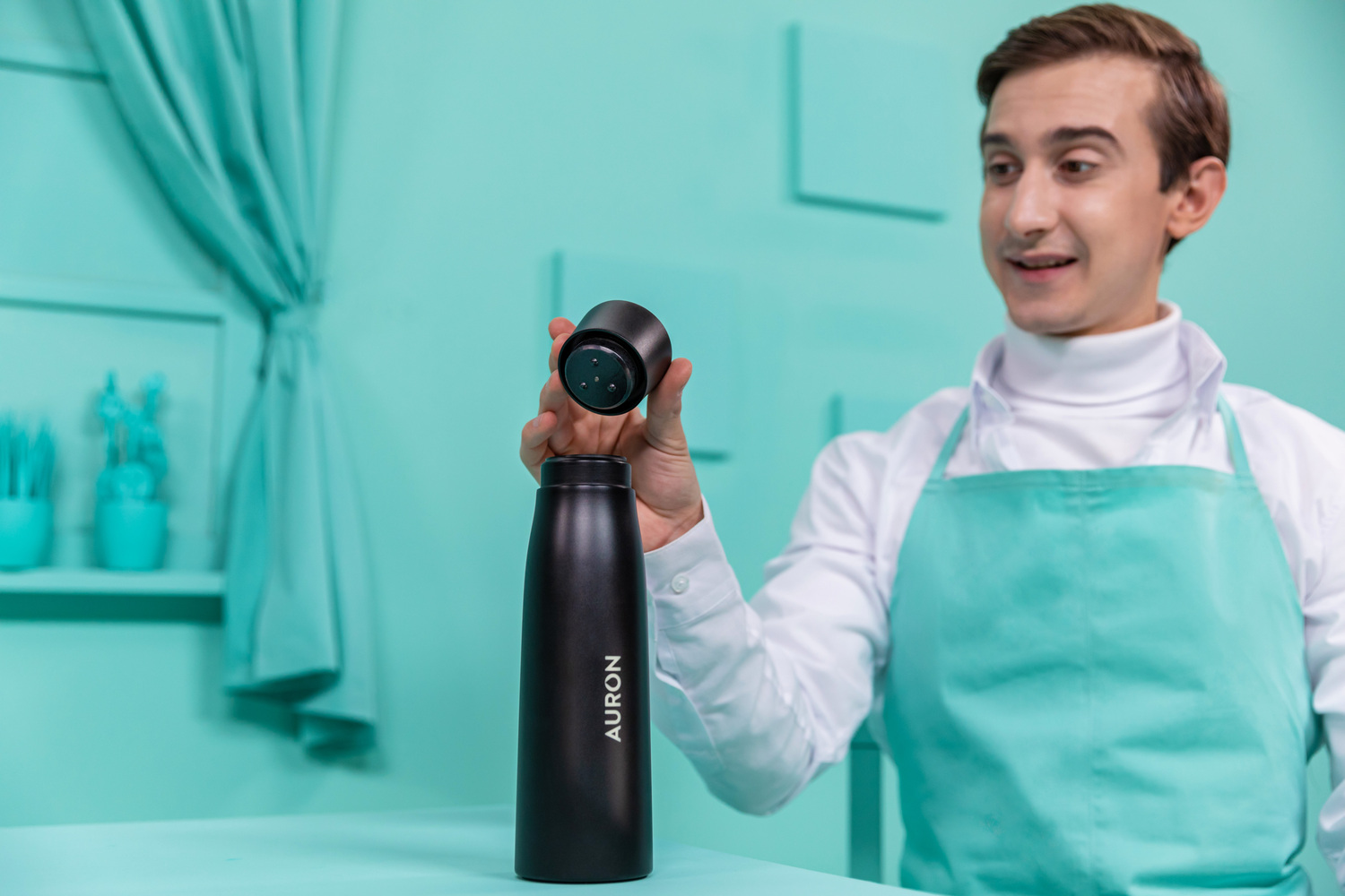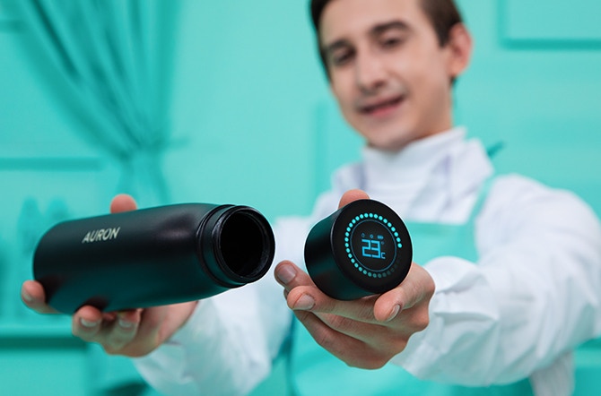 Auron functions much like a standard reusable water bottle. To use it, unscrew the vacuum-sealed lid and fill the chamber with water or any other beverage. To purify the contents and/or clean the bottle, tap the lid two times. When purification begins, a display on the lid will start a countdown of 60 seconds.