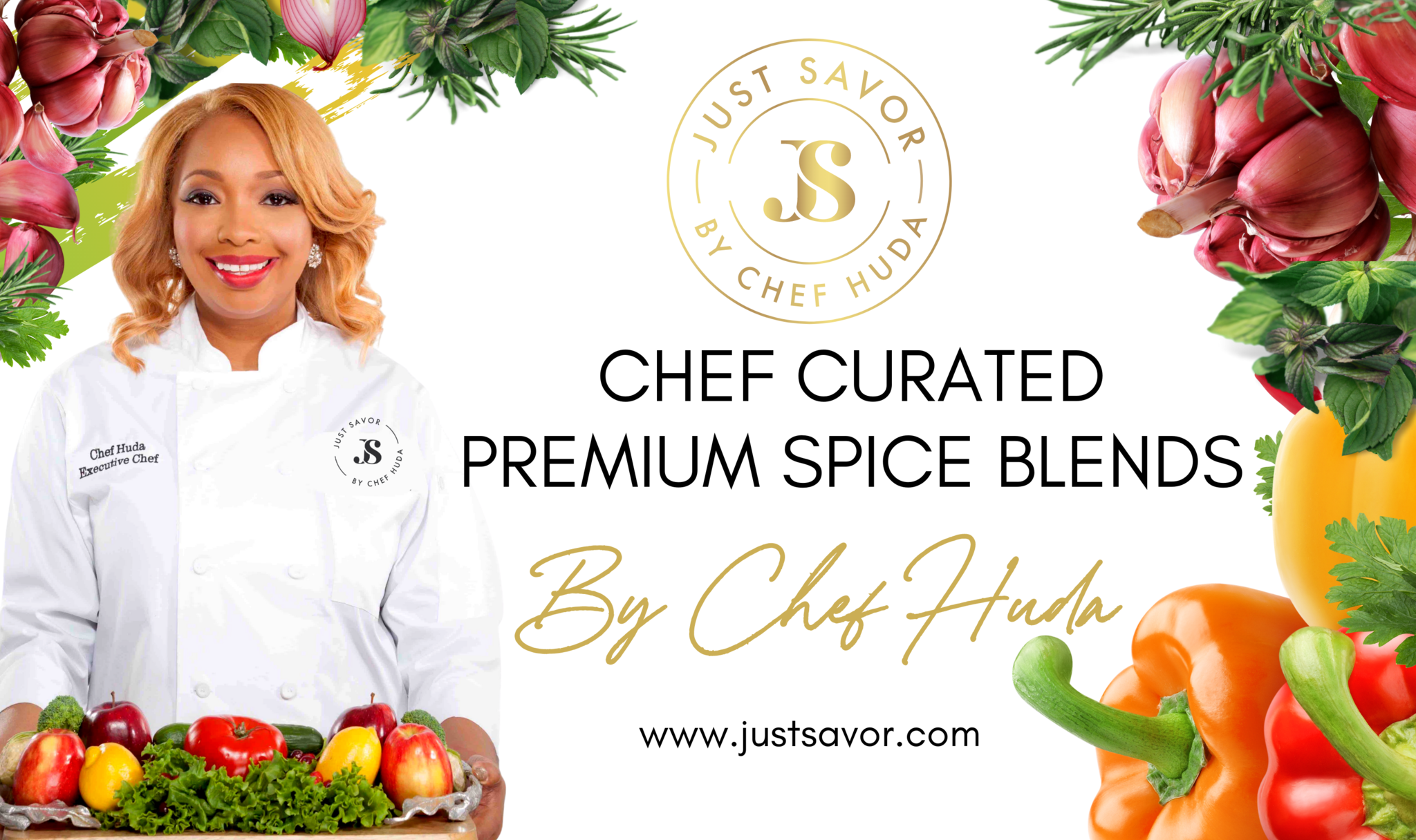 Just Savor by Chef Huda® comes in premium bottles and kraft recyclable 4-ounce pouches. There are over 20 chef-curated spice blends, including Best Sellers: Biden Beau Monde, Kamala Masala, Sweet Jerk, Turmeric Gold, Cajun Kick, Southern Sweet Heat BBQ, Garlic Goodness, Maple Sugar Magic, Spicy Garlic Madness, Jammin' Jerk, Applewood Smoked Sea Salt, Smoked Black Pepper, and Merlot Sea Salt, as well as other international blends.
