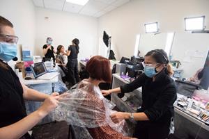 Crew prepare talent for a shoot for Salesforce at an xR (Extended Reality) Stage in Marin, Calif. on Oct. 30, 2020. Through the xR Stage, brands can continue to produce high-quality marketing and communications content “set” anywhere — with higher degrees of COVID-19 safety, convenience and creative control. (Peter Barreras/AP Images for Salesforce)