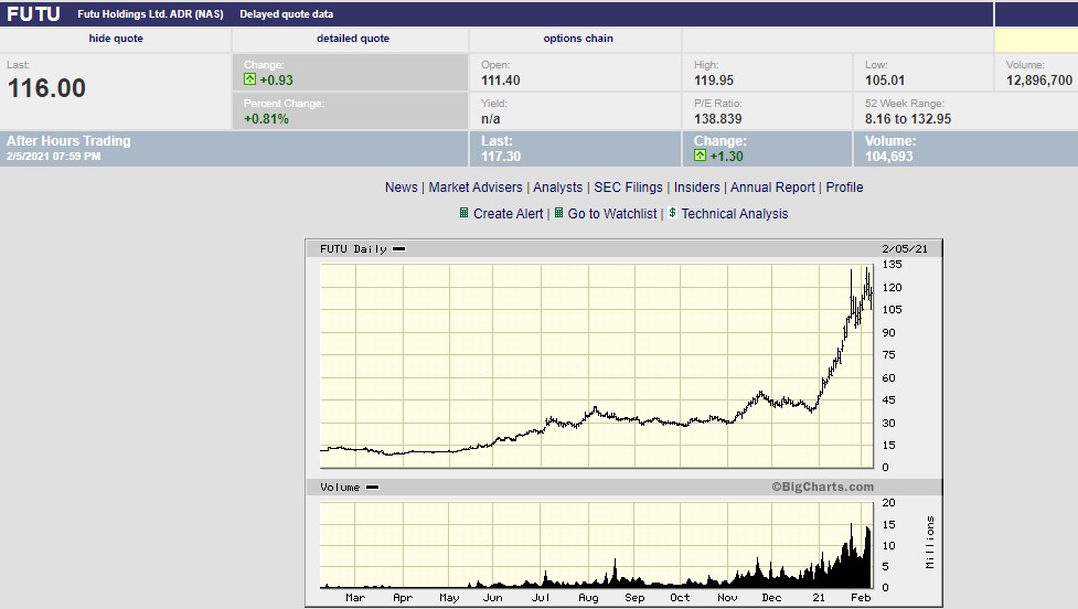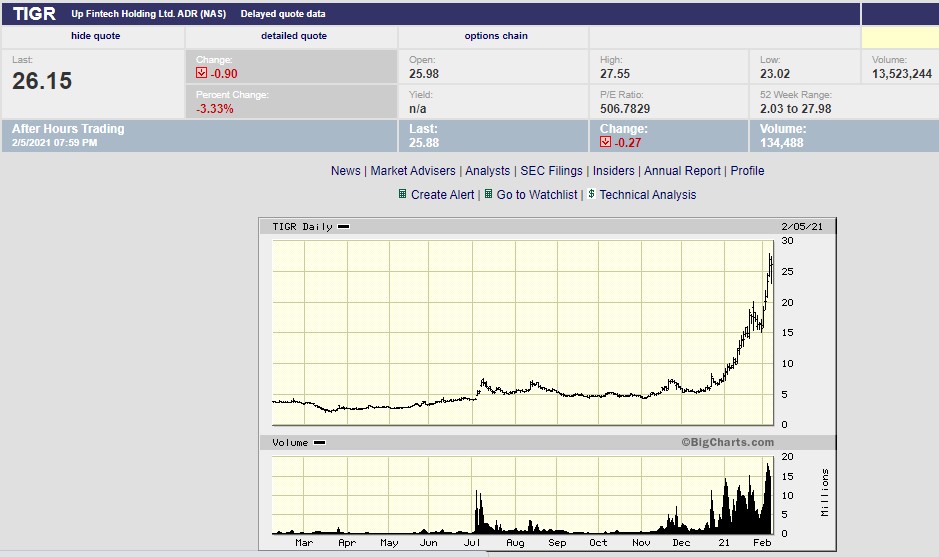 In January UP Fintech Holding Limited (NASDAQ: TIGR) also known as Tiger Brokers, climbed over 98% with little news from the company. However, this gain may be reflective of new awareness for the emerging value in Fintech oriented companies by market investors. Only about 4% of this stock is owned by institutions. This could indicate the company is still relatively undiscovered by Wall Street. The company is being called the "Robinhood of China," with revenues growing dramatically as the business plan expands. Another stand-out example in the Fintech sector is Futu Holdings Limited (NASDAQ: FUTU) where analysts have now forecasted a major upgrade. The analysts have significantly increased their revenue projections for 2021. The market seems to agree with the stock almost tripling from late December to hitting new highs in January.