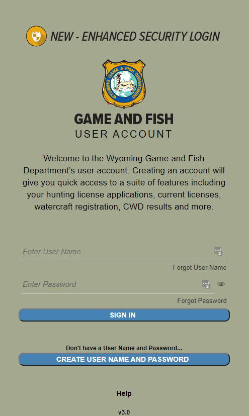 Cheyenne - Beginning today, anyone who wants to make a purchase or apply for a license from the Wyoming Game and Fish Department will be required to create a username and password. This new way to log-in to the licensing side of the Game and Fish website will increase security for customers and streamline purchases. This is the first of many improvements for the public coming to the Game and Fish website in 2021.