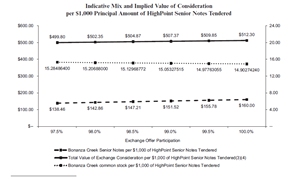 | (2) | If greater than 97.5% of HighPoint Senior Notes are validly tendered and accepted in the Exchange Offers, holders will receive a higher principal amount of Bonanza Creek Senior Notes upon proration of the aggregate principal amount of Bonanza Creek Senior Notes equal to $100 million minus the total principal amount of HighPoint Senior Notes not validly tendered and accepted in the Exchange Offers (the “Notes Consideration”). The aggregate Notes Consideration equals $100 million minus the outstanding aggregate principal amount of the HighPoint Senior Notes that are not validly tendered and accepted in the Exchange Offers. If 97.5% of the aggregate principal amount outstanding of HighPoint Senior Notes are exchanged in the Exchange Offers, $84,375,000 aggregate principal amount of Bonanza Creek Senior Notes will be issued and $15,625,000 aggregate principal amount of HighPoint Senior Notes will remain outstanding. If 100.0% of the aggregate principal amount outstanding of HighPoint Senior Notes are exchanged in the Exchange Offers, $100,000,000 aggregate principal amount of Bonanza Creek Senior Notes will be issued. |