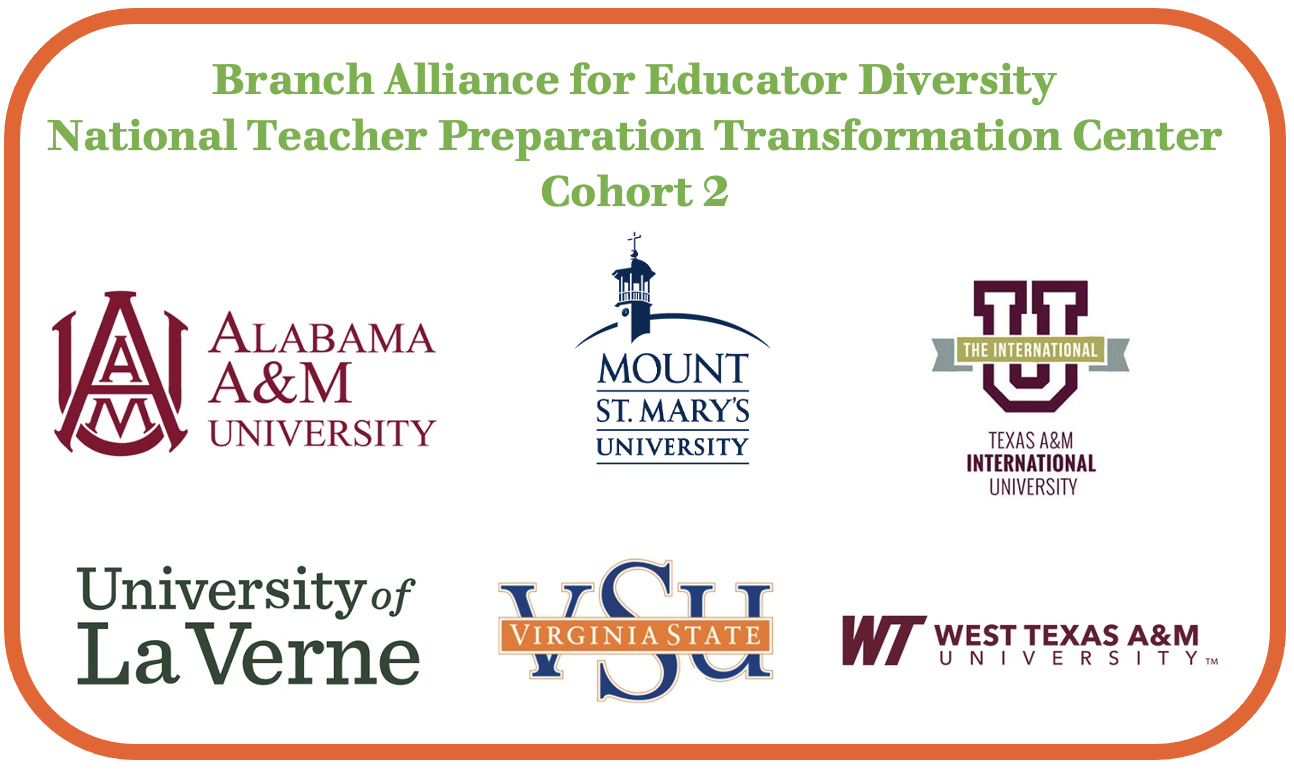 Institutions comprising BranchED’s National Teacher Preparation Transformation Center’s Cohort 2 include Alabama A&M University in Huntsville, Ala., Mount Saint Mary’s University in Los Angeles, Calif., Texas A&M International University in Laredo, Texas, University of La Verne in La Verne, Calif., Virginia State University in Petersburg, Va., and West Texas A&M University in Canyon, Texas. The pre-kindergarten through 12th-grade (PK-12) school district partners for these respective institutions also participate in the Transformation Center.