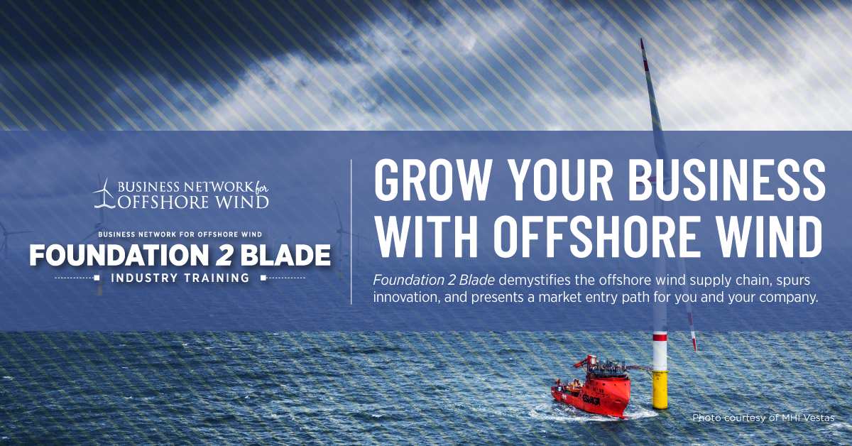 Foundation 2 Blade (F2B) is an extensive training program created to help companies identify where they fit into the growing offshore wind supply chain and create more opportunities to capitalize on prospective leads. F2B’s training course features six modules that demystify the supply chain, spur innovation, and present a market entry path for a company. F2B industry training programs will be held virtually in four, half-day training classes. Programs are currently available in March, May, and June and will be capped at 30 students per course. Students will receive 20 hours of instruction, a F2B training manual, PDF classroom handouts, and access to supplemental educational videos.