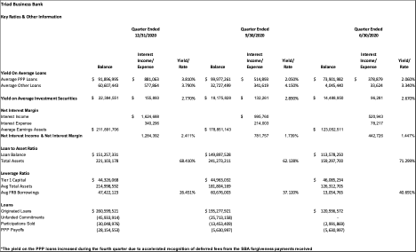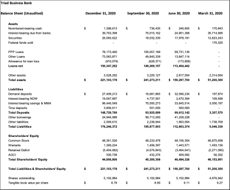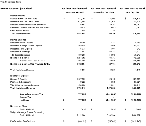 “Triad Business Bank has had an exceptional beginning which we believe will continue to propel the Bank forward to our near-term goal, which is to become operationally profitable shortly following six quarters of operation. The 2021 March and June quarters are expected to have high loan growth activity due to a continued strong loan pipeline. In addition, the March and June quarters will benefit significantly by realization of PPP loan fees from forgiveness payments from the SBA and from further origination of new PPP second draw loans under the Consolidated Appropriations Act. The rapid start has prompted an acceleration of the business plan. The loan and deposit pipelines are stronger than we had projected, however the rapid growth in revenues has been partially offset by higher personnel costs,” Hamadi commented.