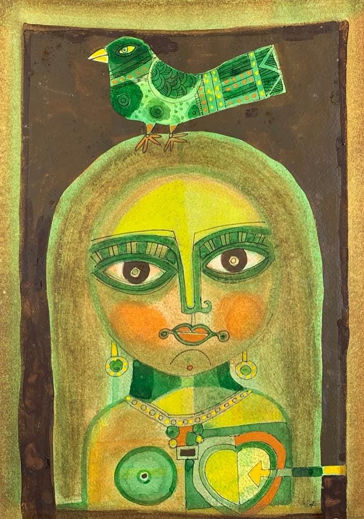 The paintings by 20th century Indian artist Badri Narayan include an ink, watercolor and silver leaf on paper titled Man with Pot of Flowers and Unicorn, 21 ¾ inches by 29 inches (sight, less frame) (est. $5,000-$8,000); and a watercolor on paper titled Girl and Bird, 15 inches by 10 inches (sight, less frame) (est. $2,000-$4,000). Both are artist signed with initial in Devanagari.