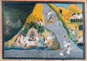 • An opaque watercolor on paper with gold leaf Ramayana illustration, depicting Rama and Sita in the forest, sleeping in clothing made of leaves, visiting a hermit or sage, painted circa 18th/19th century, 10 inches by 14 ¼ inches (sight, less frame), with inscriptions recto and verso (est. $2,000-$4,000).