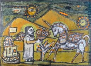Ink, watercolor and silver leaf on paper painting by the Indian artist Badri Narayan (1929-2013), titled Man with Pot of Flowers and Unicorn, 21 ¾ inches by 29 inches (est. $5,000-$8,000).