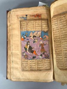 The Shah-nameh (or Book of Kings, Iran’s central literary work) is a rare, 17th century Persian manuscript with 14 miniature paintings, depicting various court scenes. The book, bound in goat skin, measures 17 inches by 10 inches and carries an estimate of $1,000-$2,000. It’s in fragile condition (despite being re-margined in the 19th century), and has brittle sheets, losses and wear.