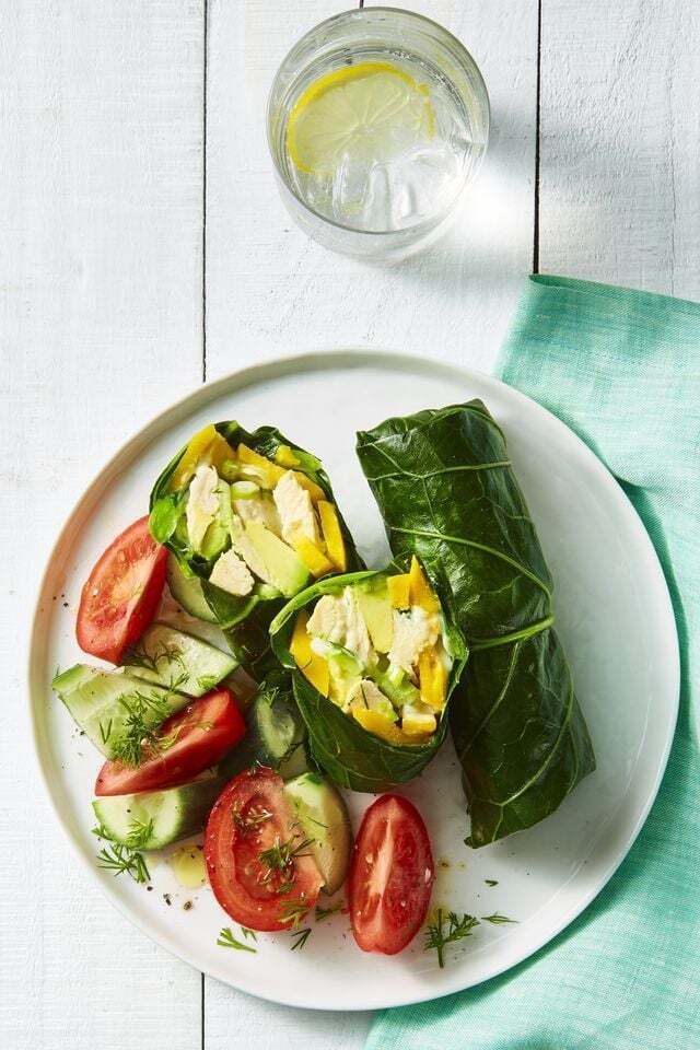 Lay collard greens on a work surface, fill each with chicken salad and mango slices, then wrap like a burrito. Serve with tomato-and-cucumber salad.
