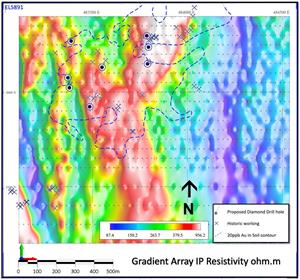 Fig 3. Gradient Array IP Resistivity with gold in soil contour and 8 proposed drill hole locations.