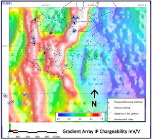 Correlation with ground geology has identified the peak chargeability associated with gossanous altered granite that is mineralized with gold. There is a broad spatial association of chargeability trends with gold in soil geochemical anomalisms across the property.