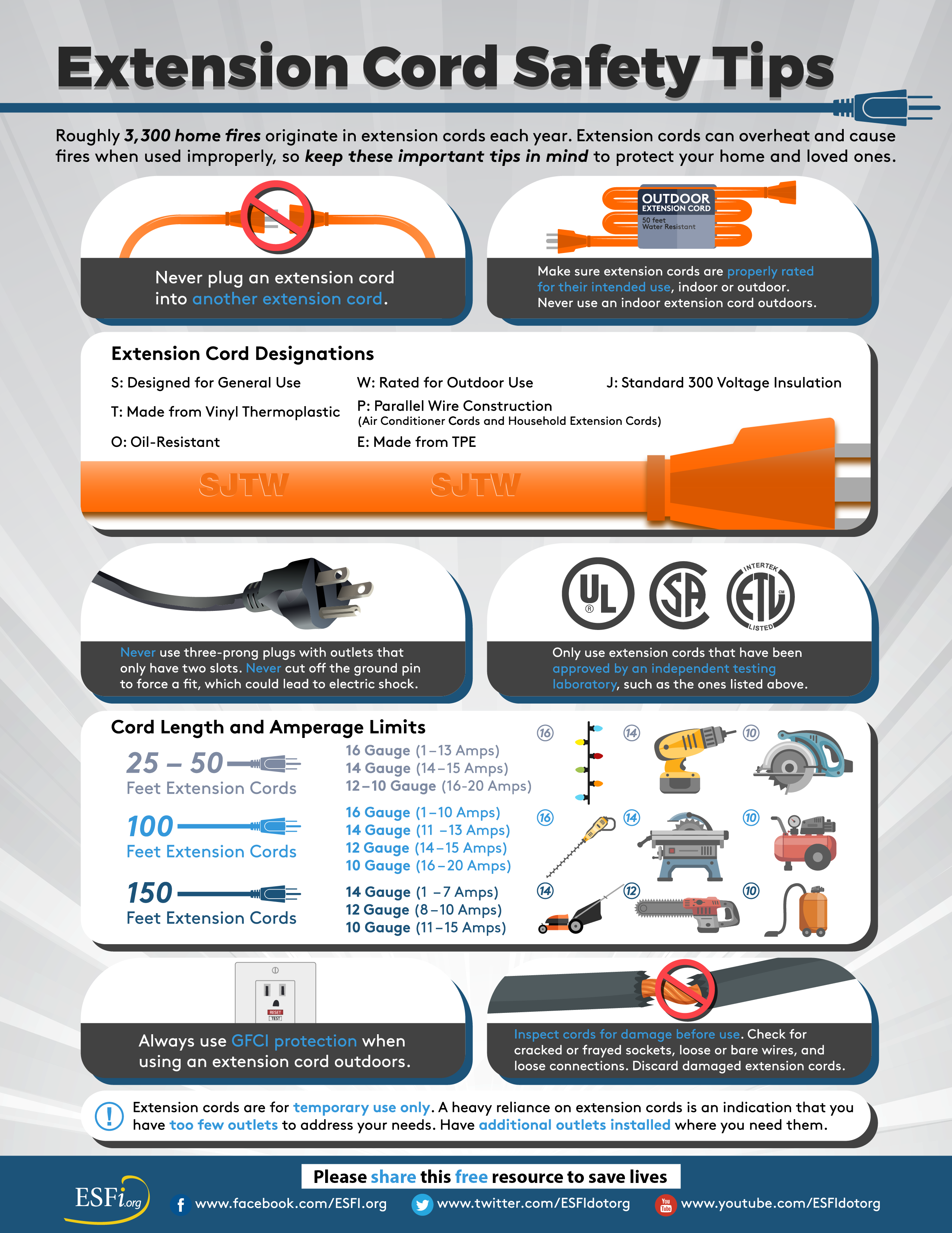 ESFI’s website, esfi.org, offers a variety of free resources and information that can be shared with your family, community, and workplace. Follow these basic guidelines to help prevent serious electrical and fire hazards during DIY and spring cleaning projects: