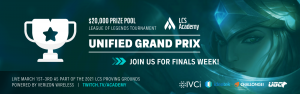 The Unified Esports Association partnered with the League Championship Series to host this Spring's first Tier 1 event, the "Unified Grand Prix." (UGP) The UGP started on February 22nd--the 7-day long event goes through March 3rd and features a prize pool of $20,000. The top 10 teams from the Tier 2 Tournaments in the 2021 LCS Proving Grounds Circuit qualify for the event, as well as the 7th and 8th seeded teams from the Spring 2021 Academy season. The teams include: Barrage, C9 Amateur, CLG Academy, EG Prodigies, Maryville University, No Org, Revival, SolaFide, Supernova, TSM Academy, Winthrop University, and Zoos Gaming. The top 4 teams out of the 12 teams competing from the Unified Grand Prix will move on to compete in the 2021 LCS Proving Grounds this April.