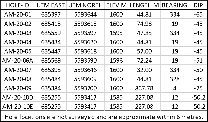 Collar locations are in UTM Zone 10N metric co-ordinates, and depths and analytical results are presented in the three tables below for holes AM-20-01 to 06A, 07 and 08 with a separate table for holes 09, 10D and 10E.