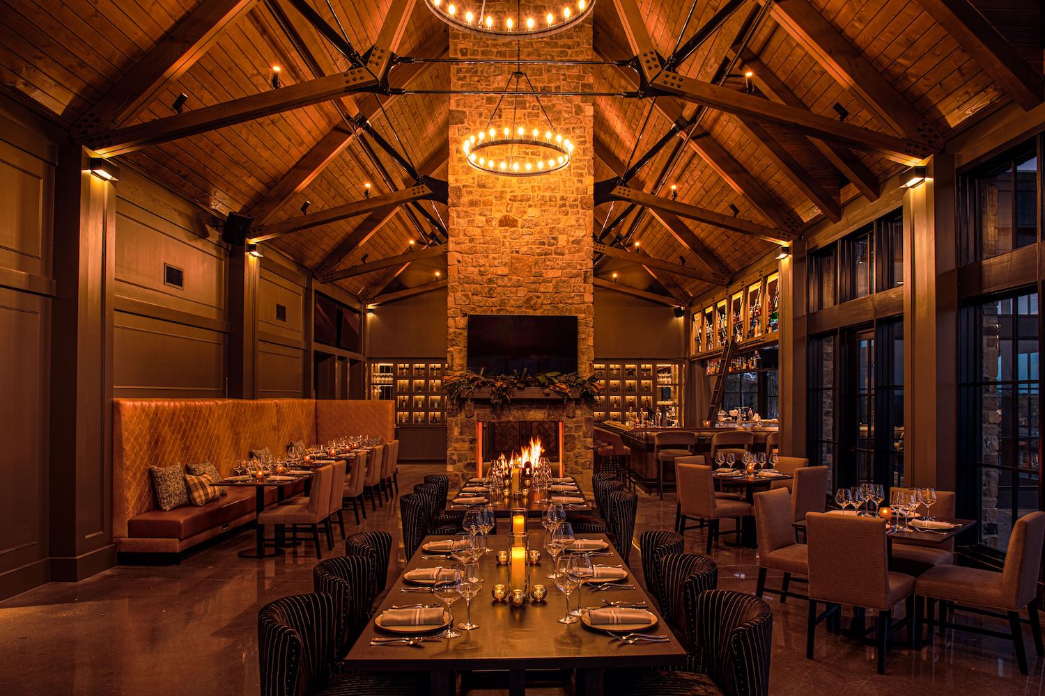 Large rustic wooden doors featuring the unique McLemore brand open to The Creag, [kreyg] a restaurant that draws inspiration from the area’s Scottish heritage and natural landscape of southern Appalachia. With soaring floor to ceiling windows and vaulted beam ceilings, the space comes alive with enjoyment of the double-sided fireplace and large window walls that open fully to bring the beauty of the area inside.