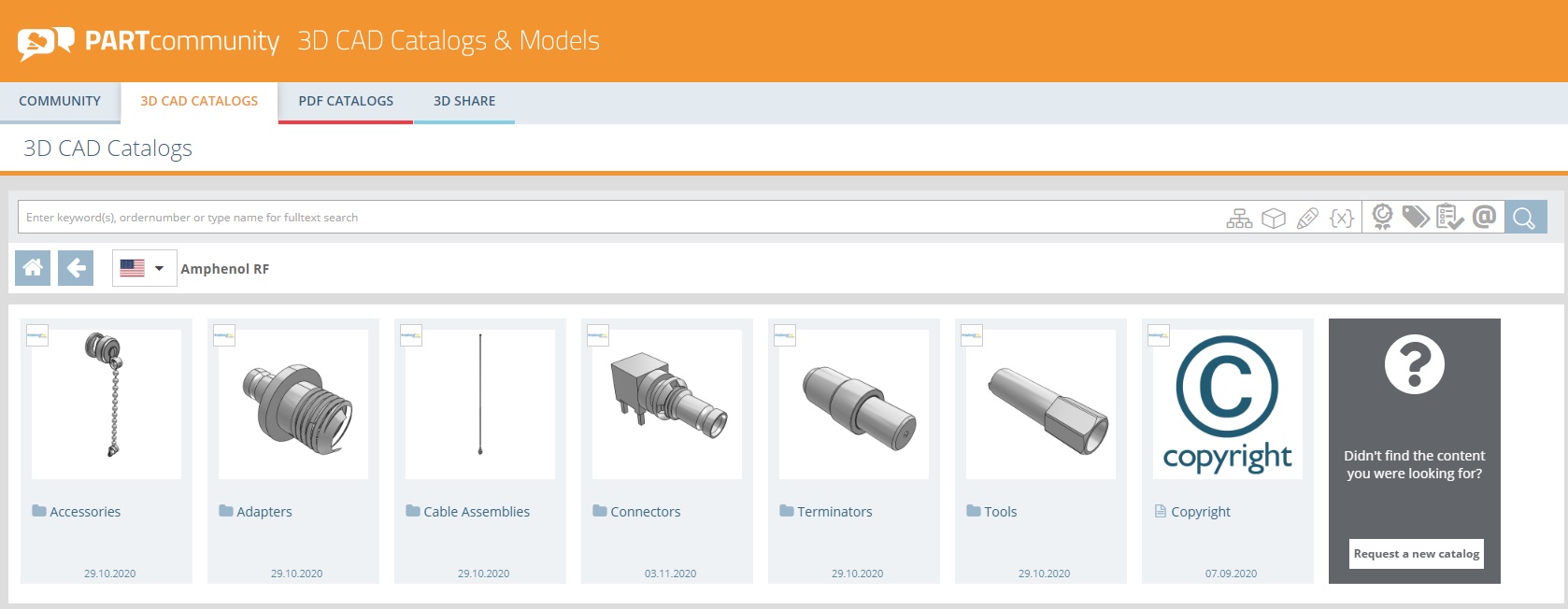 DANBURY, CONNECTICUT, UNITED STATES, March 9, 2021 /EINPresswire.com/ -- Amphenol RF is excited to provide on-demand 3D CAD models via the B2B community powered by Cadenas PARTSolutions. With over 800 part numbers now available and more coming, this industry-leading tool provides engineers with a convenient resource to design RF products directly in their system.The new catalog provides a variety of RF products in an on-demand format that allows engineers access to resources in a more efficient and accessible format. Engineers now have the ability to download relevant product models in different formats for use in several different CAD software programs. This is pivotal in saving time and effort within the design process, eliminating the extensive lead time involved in requesting physical samples. These downloads include metadata which is then prepopulated into the CAD software of your choice.