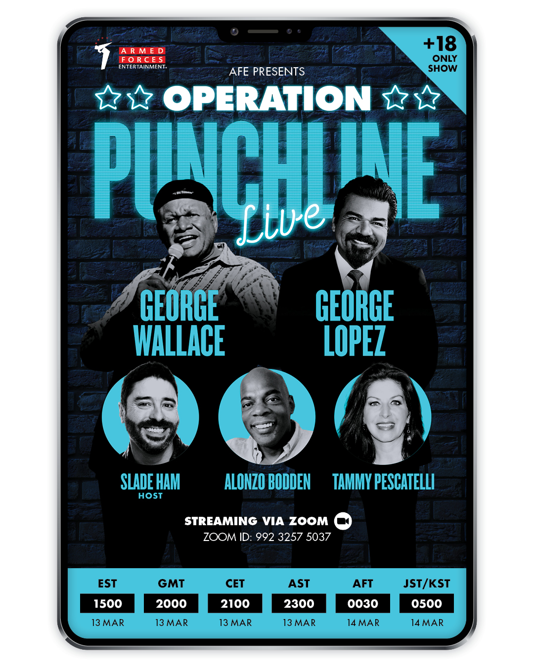 Operation Punchline has been a longstanding effort, seeing legendary acts travel out from country to country, if only to bring one smile or laugh to an active duty audience members. For our first virtual, stand-up comedy show, Alonzo Bodden, George Lopez, Tammy Pescatelli, and George Wallace join Slade for a performance that can be watched by all military members wherever they are stationed. This marks AFE’s first live virtual event, altogether.