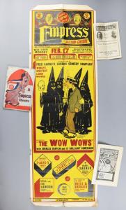 “The Wow Wows” was a 29-minute show, performed in three scenes, the premise being Chaplin's character was told he would be initiated into a secret society, when in fact the others were getting revenge on him. The comedy debuted in 1910 in New York. Included in the lot are some small playbills for "The Wow Wows" that have some great advertising for the San Diego area. The poster and playbills have a modest estimate of $300-$3,500.