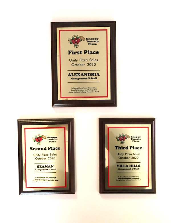 The month of October doubled as National Bullying Prevention Month and National Pizza Month. Snappy Tomato considered the duality of these events as the perfect opportunity to demonstrate support for bullying prevention and celebrate all things pizza. Snappy Tomato stores competed against one-another to acquire the highest number of donations by selling the greatest number of Unity Pizza. Armed with the slogan, “Add Cheddar. Make it Better” made it easier for employees to reiterate the Unity Pizza concept online, in-store and on the phone. At the conclusion of the month of October all sales were accumulated and the top three Snappy Tomato Pizzerias were honored for their efforts: