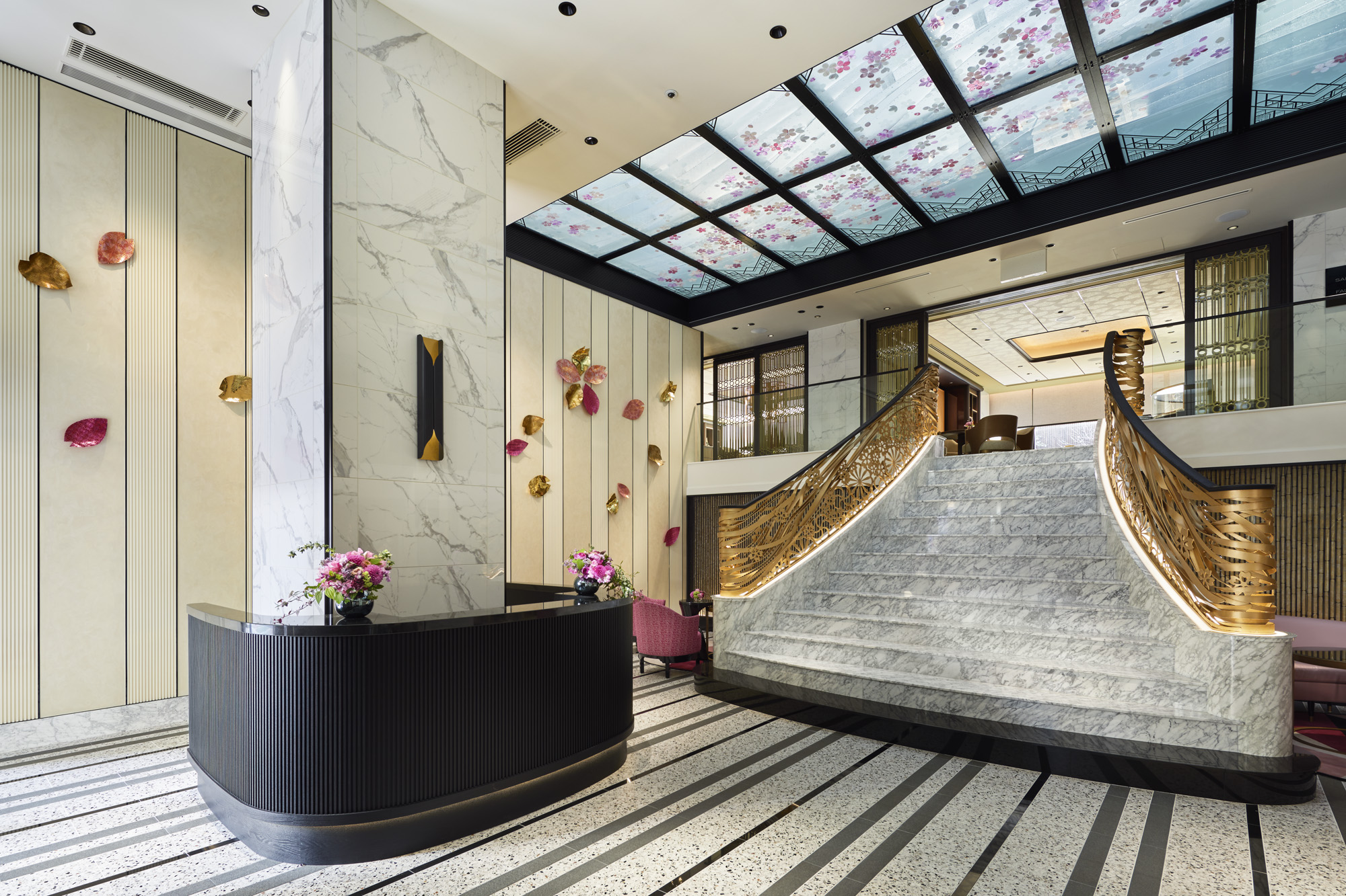 FAUCHON meets Kyoto in this exceptional marriage of the iconic French FAUCHON hospitality brand with the traditional design and cultural elements of Japan, achieved by Spin Design Studio of Japan together with Atelier Paluel-Marmont in Paris. The new property is a masterful blend of FAUCHON style featuring magenta, black, and gold with a nod to its Japanese location. As an example, there are black painted bamboo accents on the walls, Sakura petals incorporated in many design elements including on the lobby ceiling lights as well as fabrics in the guest rooms and suites, and Washi paper (used in Origami) on the wall above the headboards in the guest rooms. Another design element is the beautiful bedside lighting which represents the French mille-feuille pastry.